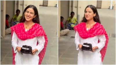 Sara Ali Khan has always been a favourite among the paparazzi, known for her cheerful and engaging chats that often brighten social media feeds. On her birthday today, she chose to celebrate in a unique way by sharing the moment with the very photographers who follow her. Clips circulating widely online show Sara joyfully cutting a cake alongside the paparazzi, spreading smiles all around.Radiant in traditional attireIn the clip, Sara looked radiant in a white chikankari kurta complemented by a soft pink dupatta. She completed her traditional ensemble with elegant juttis, while a tilak on her forehead and a delicate pendant around her neck suggested she had just attended a ritual. Greeting the paparazzi warmly, she received their heartfelt birthday wishes. The moment turned sweeter as Sara cut a chocolate cake amid joyous singing of “Happy Birthday.” After expressing her gratitude, she quietly stepped indoors.
